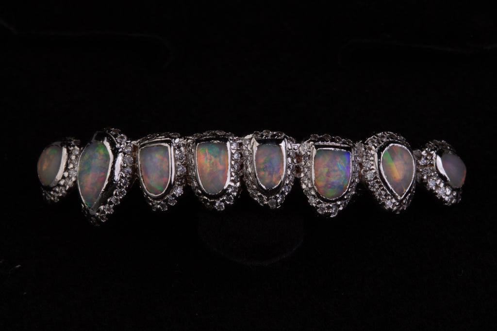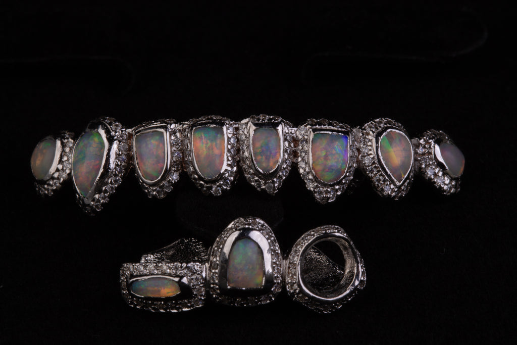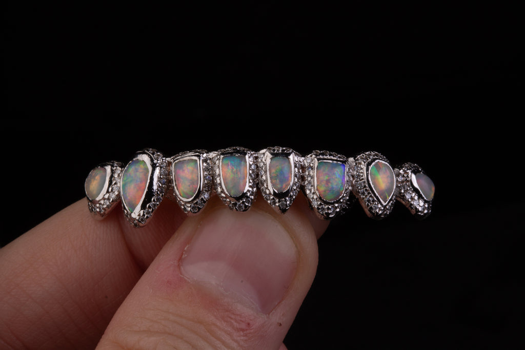 Grillz 3x8 em prata 1000 banhado em ouro branco, nichos de cravação feito em 3D para receber pedra opala furta cor centrais e restante da Cravação em moissanite branca.