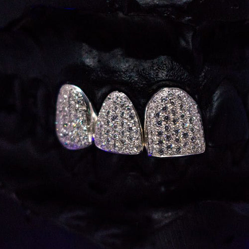 Grillz 3 dentes em prata 1000 cravejado com pedras sintéticas brancas.