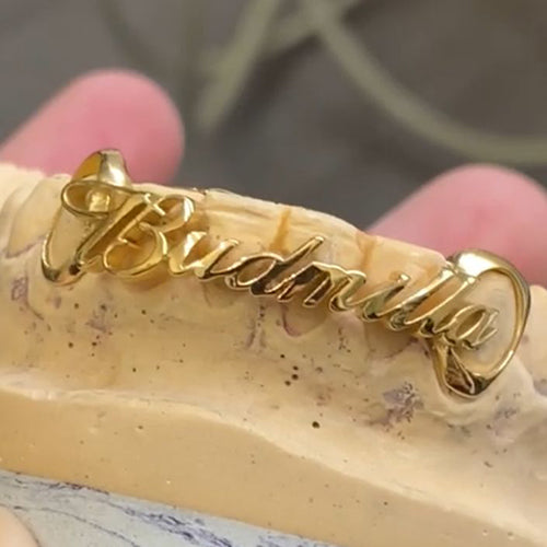 Grillz em 6 dentes superiores e 6 dentes inferiores em prata 1000, personalizada ao gosto do cliente trazendo suas referências particulares, letras e números feitos em buril e laser.