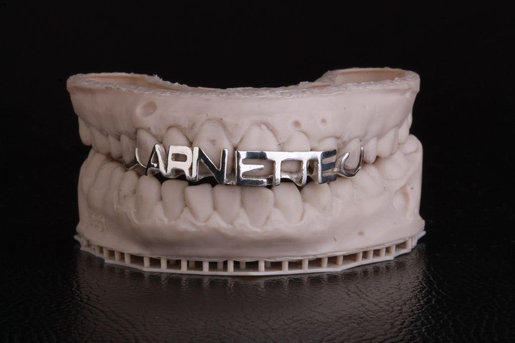 Grillz 8x superior em prata 1000, joia personalizada letreiro em 3D para campanha marca ARNETTE com embaixador Veigh.