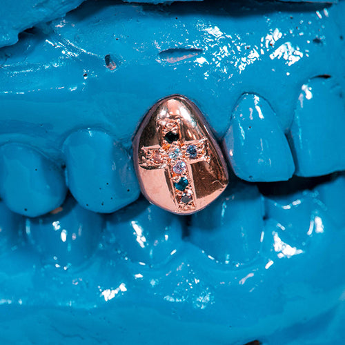 Grillz simples em prata 1000 banhado a ouro rosé cravação com pedra sintética em formato